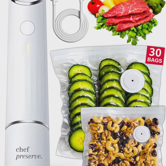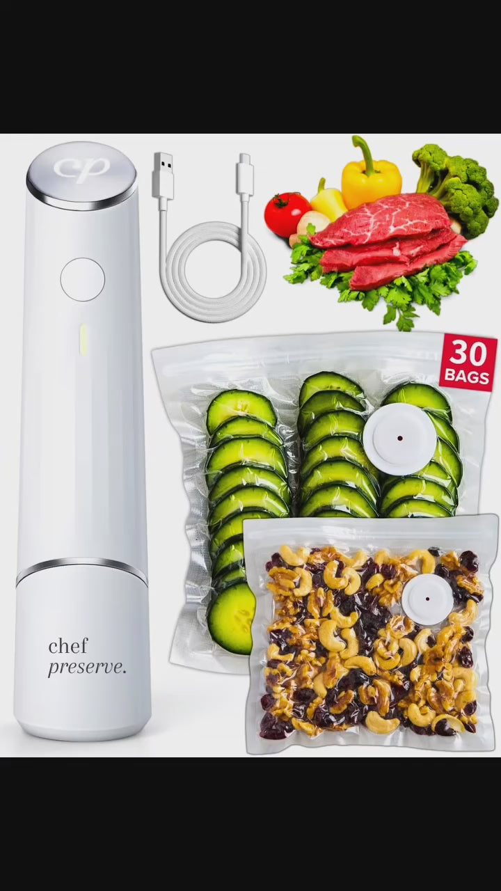 - ❌ NO MORE HEAVY AND BULKY VACUUM SEALERS: Old-fashioned vacuum sealers take a lot of space in your kitchen, not to mention the huge single-use plastic rolls and waste. Chef Preserve hand held vacuum sealer is the size of a pepper grinder, and super easy to use.